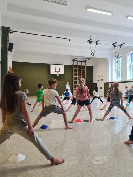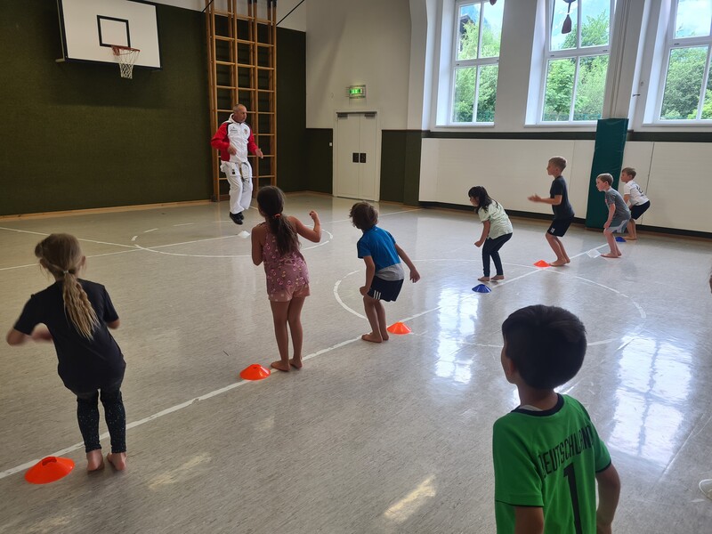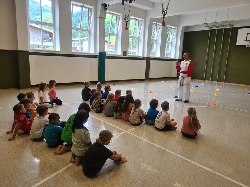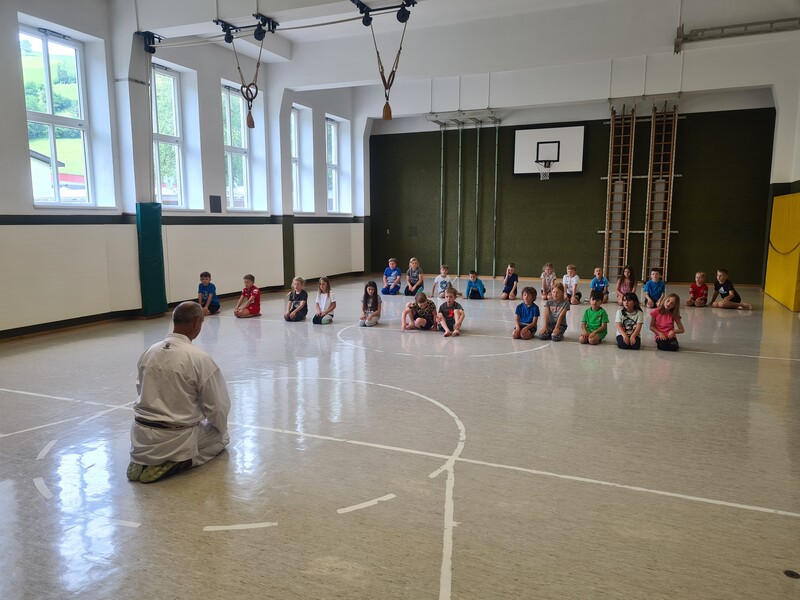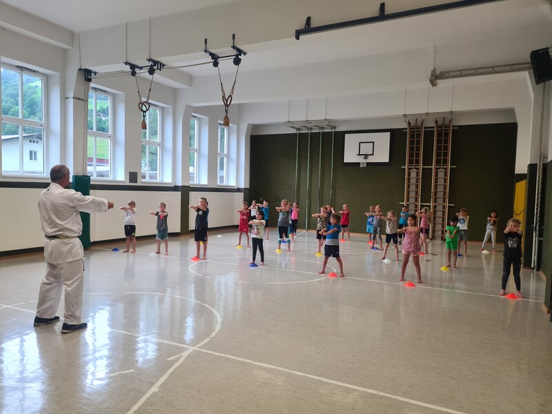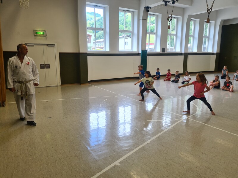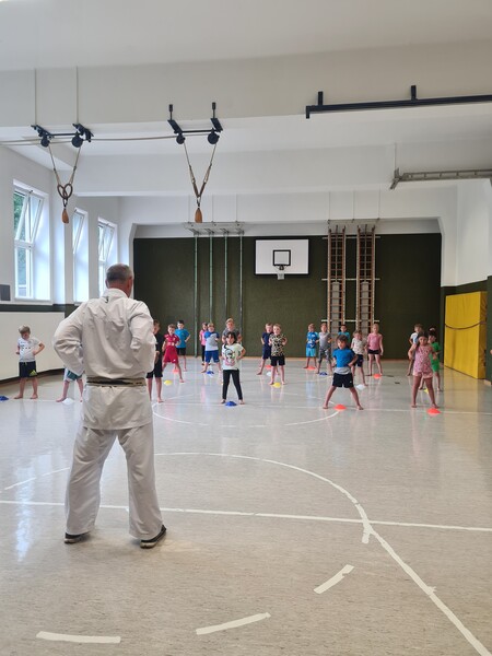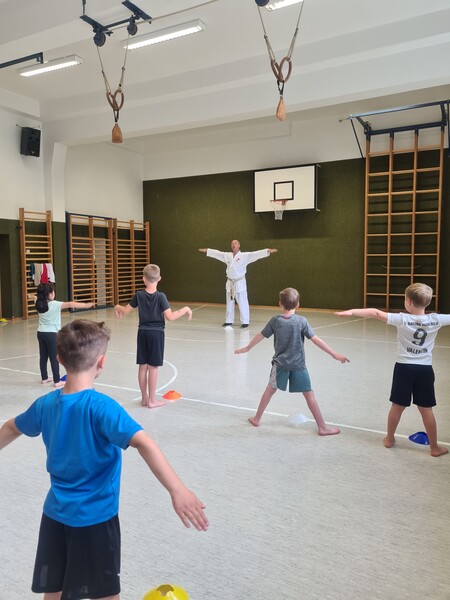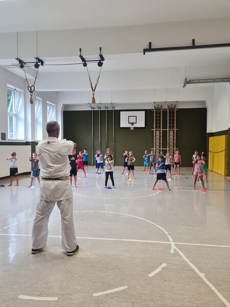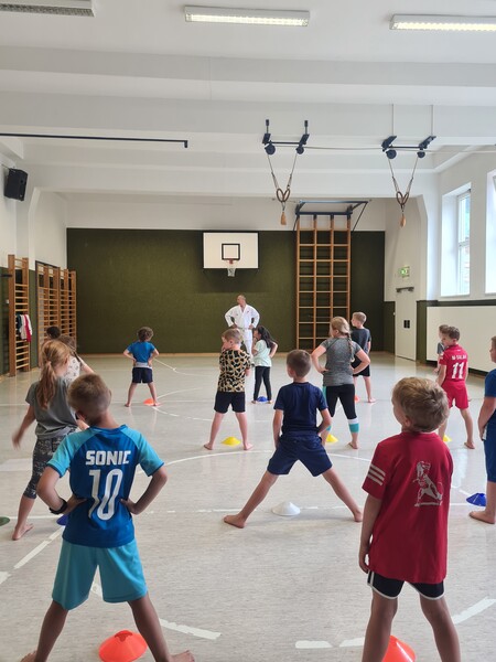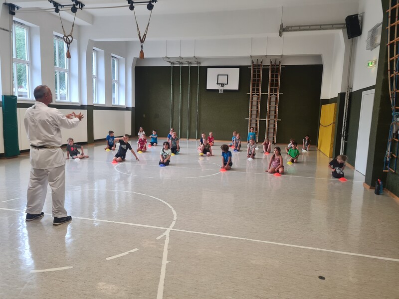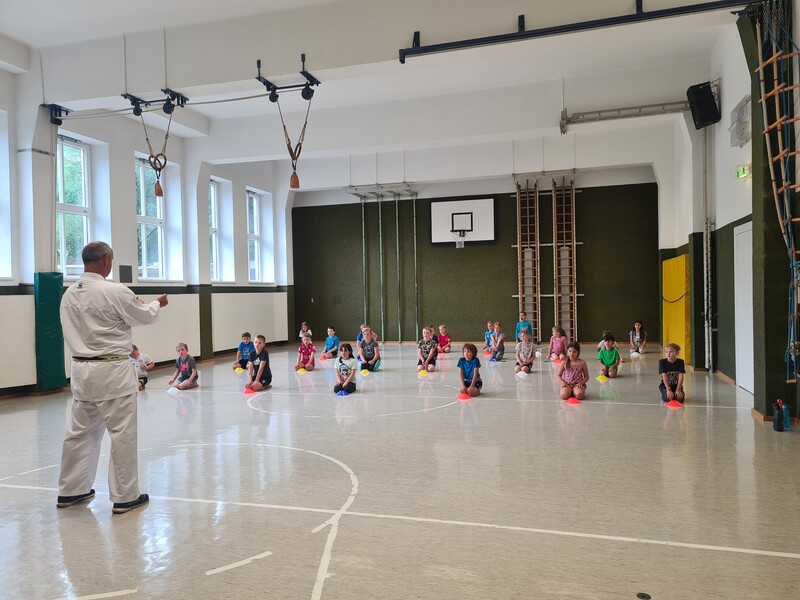 Kraft, Koordination und Disziplin waren bei der Karatestunde mit den 1. Klassen gefragt. Alle Kinder waren mit Eifer dabei und gaben ihr Bestes. Für ihre Sportlichkeit bekamen sie ein großes Lob. Es war echt cool!