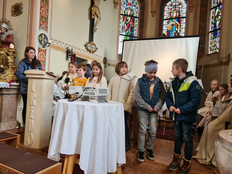 Im Rahmen eines festlichen Gottesdienstes mit unserem Pfarrer Ananda begingen wir eine Stunde im Gedenken an die Ostergeschichte. Unsere 4. Klassen gestalteten Bilder zum Kreuzweg Jesu, die sie mit gelesenen Texten vorstellten. Alle Kinder waren mit Eifer dabei!