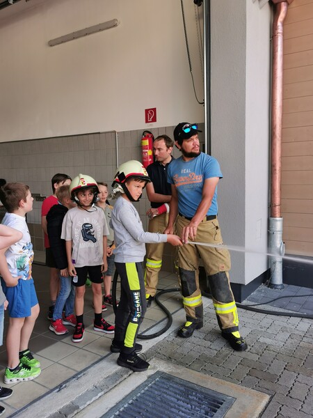 Die Fahrt mit Blaulicht zum Feuerwehrhaus war ein Highlight für alle. Dort durften die Kinder mit dem Feuerwehrschlauch löschen. Außerdem besichtigten wir die Fahrzeughalle, die Schulungs- und Aufenthaltsräume sowie die Funkzentrale.