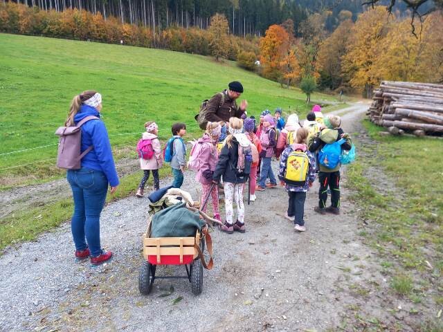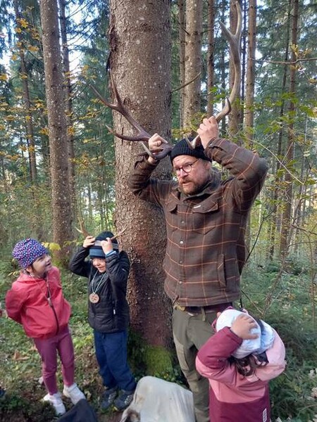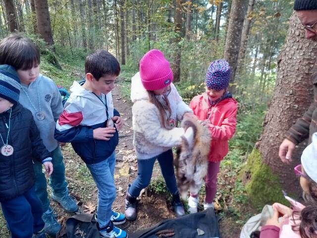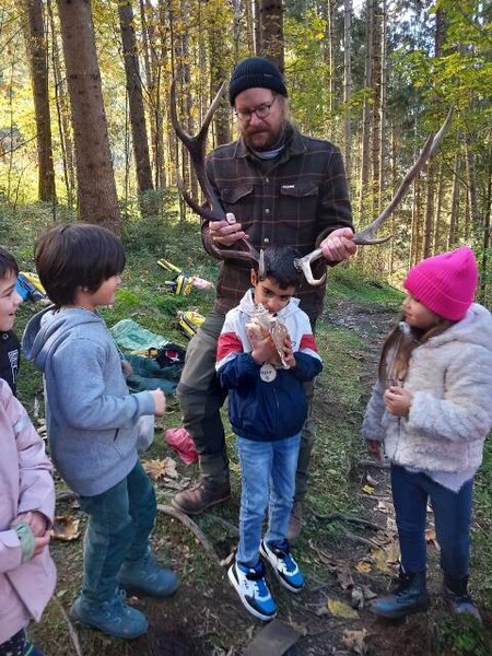 Herr Brandl hatte ein ausgestopftes Eichhörnchen sowie Tierfelle und Geweihe dabei, die die Kinder anschauen und angreifen durften.